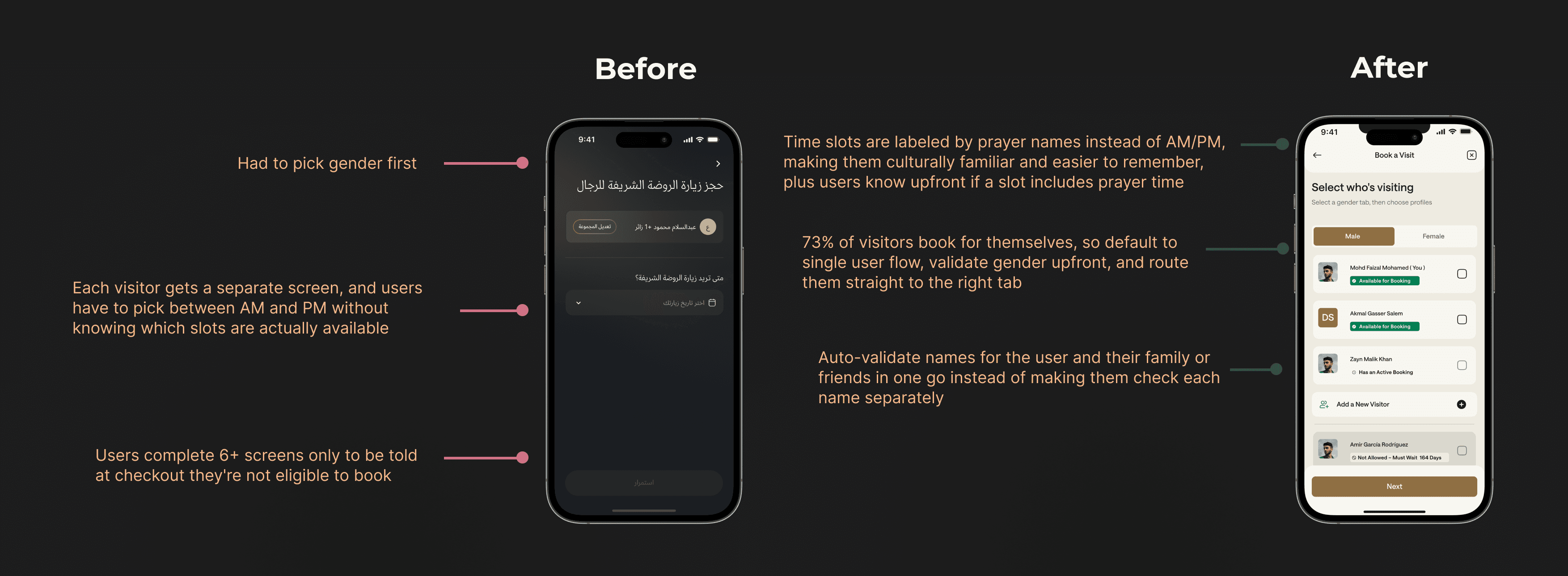 For the Ministry of Hajj and Umrah this wasn't just bad UX, It threatened Saudi Arabia's Vision 2030 digital transformation goals, Black market enforcement drained security resources, The platform crashed during Friday slot releases. Every failed booking became a diplomatic issue with countries whose citizens couldn't book